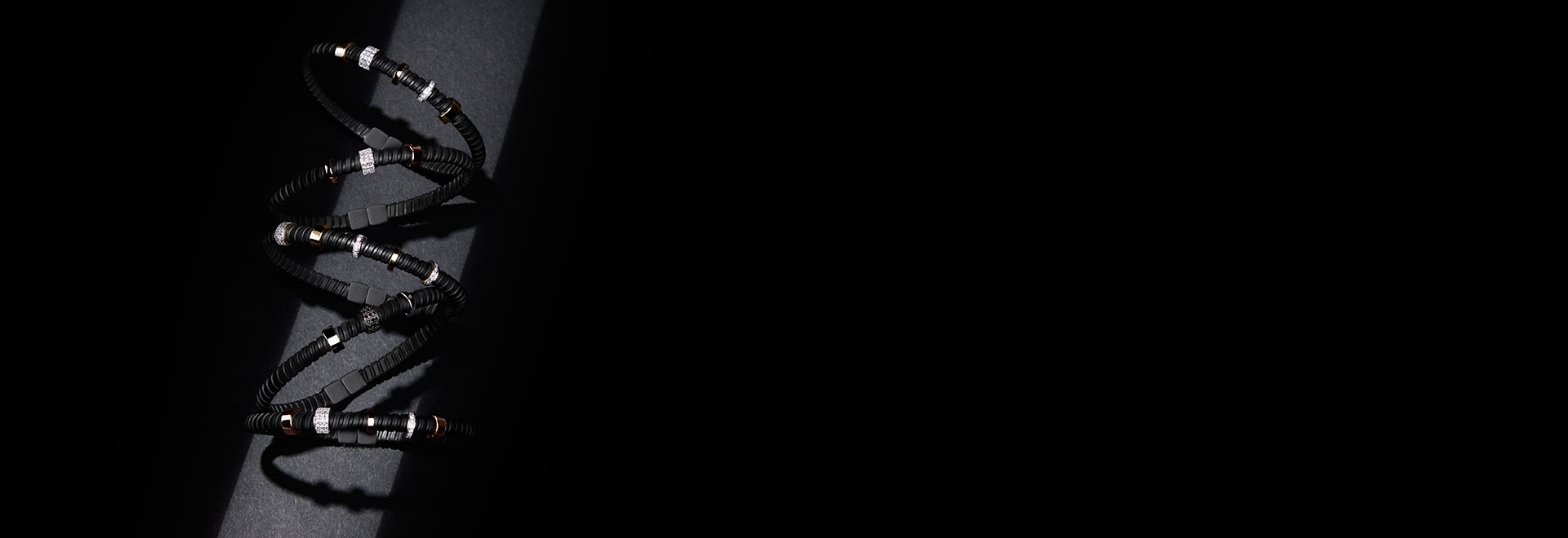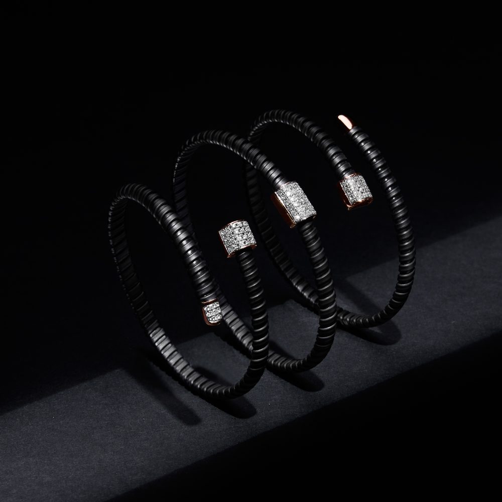 La collezione Prestige Noir è un’espressione di eleganza contemporanea, che unisce l’artigianato tradizionale a un design moderno e sofisticato. Realizzata con la tecnica del tubogas, questa linea fonde l’oro, i diamanti e l’acciaio nero, creando un connubio che esalta raffinatezza e fascino. Il nero dell’acciaio si armonizza con l’oro e i diamanti, offrendo un contrasto che esalta la brillantezza delle pietre preziose e l'eleganza del metallo.