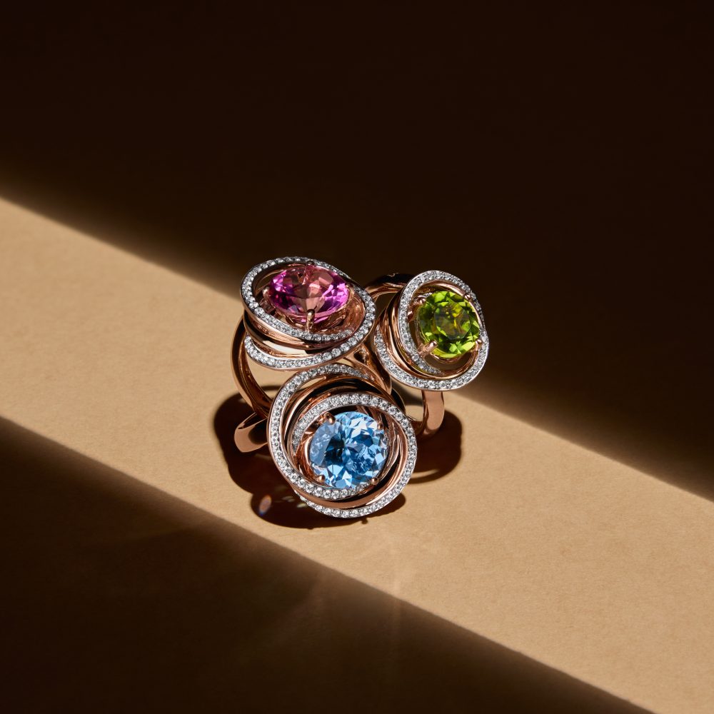 The harmonious, enveloping design combines bands of gold that embrace a perfectly-cut semi-precious stone embraced in a setting of sparkling diamonds. Hand-cut with extreme precision, the central stone gives off a vibrant, deep light, catching the eye and adding a touch of intense, refined colour.