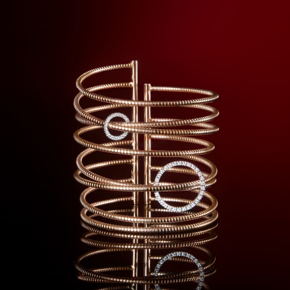 The Kaos Collection comes to life through the evolution of circular forms, where dynamism links with elegance. From apparent chance comes a harmonious composition, in which free forms combine with a refined and sophisticated aesthetic. The stylistic study is oriented towards a chaotic and irregular movement, where the artisanal tubogas technique is transformed into a contemporary cult thanks to the innovative design of K di Kuore.