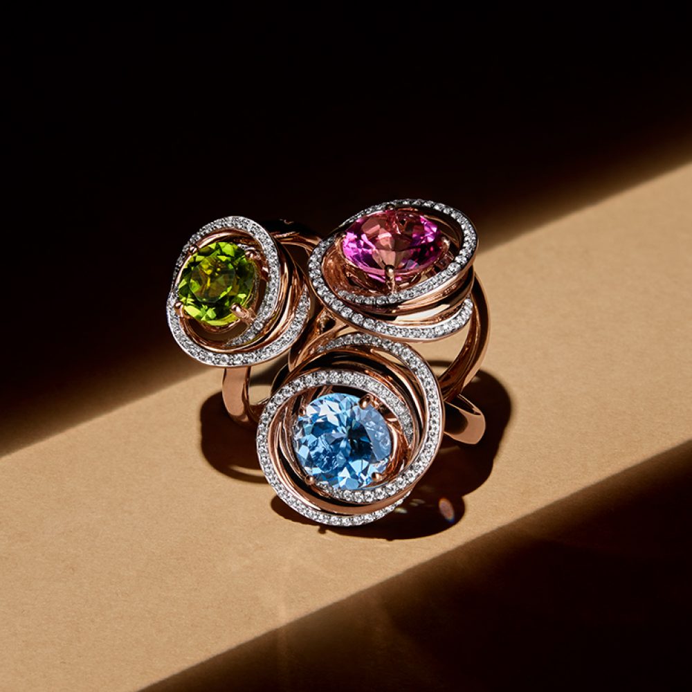 Il design armonioso e avvolgente unisce fasce d'oro che abbracciano una pietra semi-preziosa dal taglio perfetto, incastonata in cerchi di diamanti splendenti. Tagliata a mano con estrema precisione, la pietra centrale sprigiona una luce vibrante e profonda, catturando l'attenzione e aggiungendo un tocco di colore intenso e raffinato.